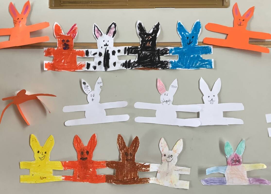 Für die 1. und 2.Klassen wurde ein vielfältiges Stationsprogramm angeboten. Die Kinder konnten frei wählen und sich an unterschiedlichen Stationen ausprobieren: Beim Bemalen von Ostereiern mit Wasserfarben entstanden kleine Kunstwerke, während an einer anderen Station Hasengirlanden gebastelt und fröhliche Hasenlieder gesungen wurden. Auch die Bewegung kam nicht zu kurz – beim sportlichen Osterangebot mit Eierlauf und anderen Spielen konnten sich die Kinder aktiv austoben. Zusätzlich wurden bunte Ostereier aus Papier gewebt, wodurch auch die Kreativität und Feinmotorik gefördert wurden.